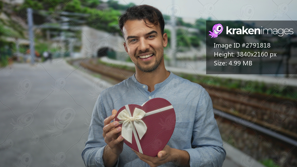 Young hispanic man holding heart shaped gift in outdoor train station, smiling while standing near railway, surrounded by greenery and enjoying a pleasant moment. - Kraken Images