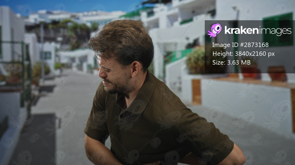 Young hispanic man holding lower back for backache on sunlit street with white buildings and green shutters, squinting from discomfort; pain.