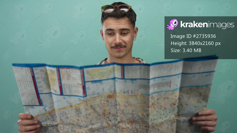 Young hispanic man holding map against blue wall exploring travel plans during vacation