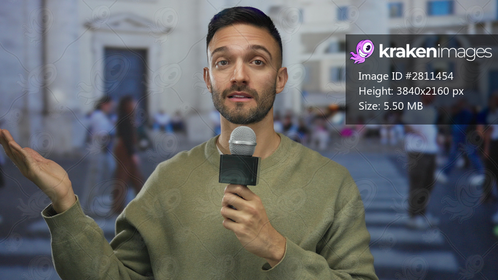 Young hispanic man holding microphone during interview on urban street with blurred people and architecture in background.
