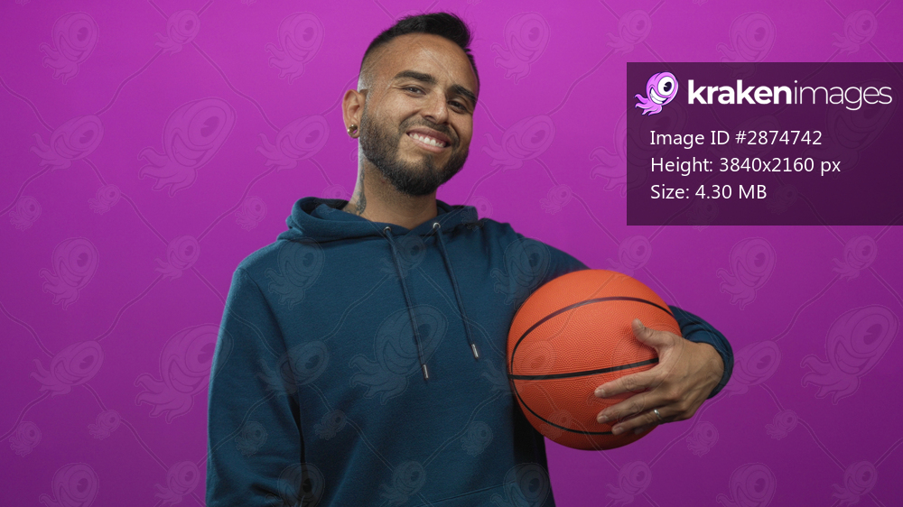 Young hispanic man holding orange basketball with hands, smiling at camera in studio against purple backdrop wearing teal hoodie and beard; confidence teamwork. - Kraken Images