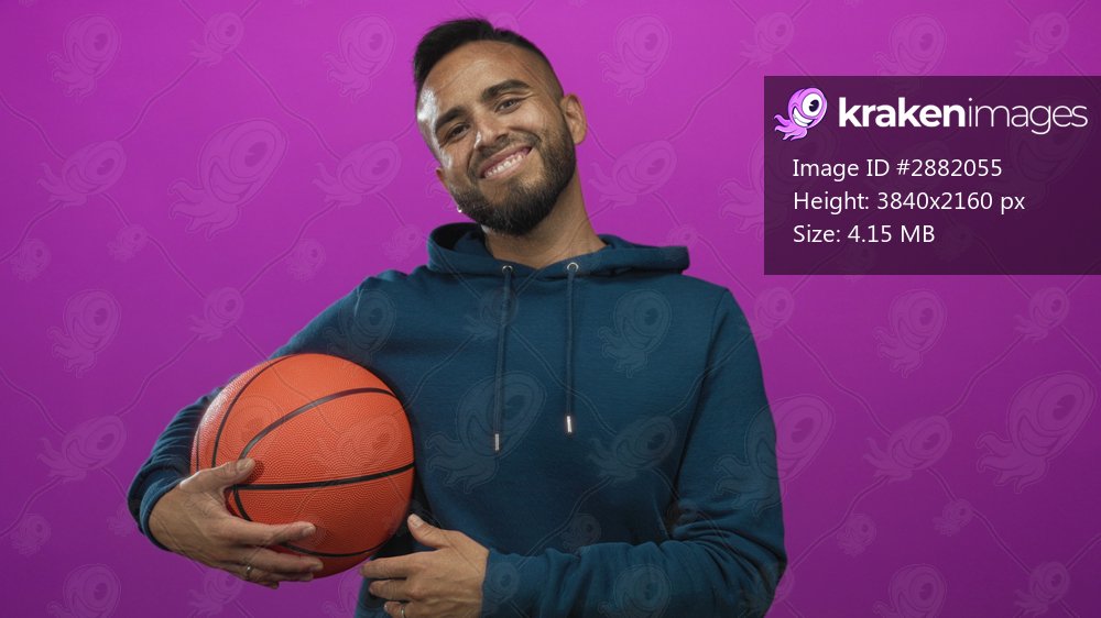 Young hispanic man holding orange basketball with hands, smiling at camera in studio against purple backdrop wearing teal hoodie and beard; confidence teamwork. - Kraken Images