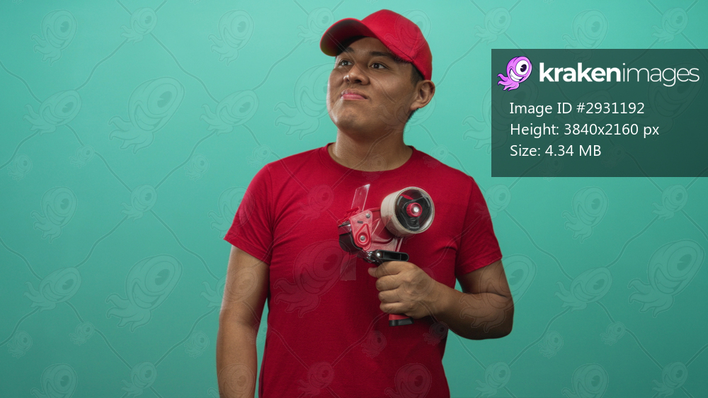 Young hispanic man holding packing tape dispenser in studio with teal backdrop; confident and hardworking.