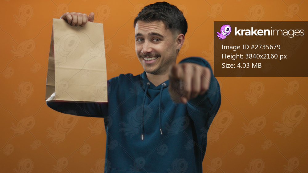Young hispanic man holding paper bag pointing toward camera against isolated orange background suggesting engagement and interaction
