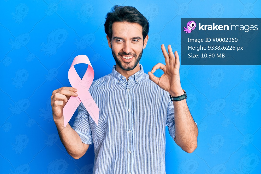 Young hispanic man holding pink cancer ribbon doing ok sign with fingers, smiling friendly gesturing excellent symbol
