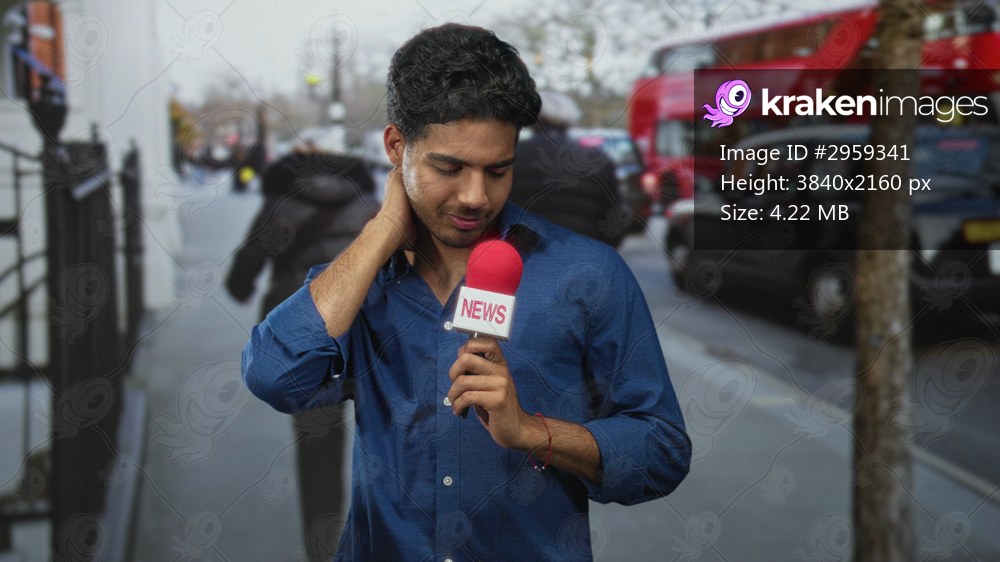 Young hispanic man holding red news microphone rubs neck on busy city street beside black taxi and passing pedestrian; hesitation reflection.