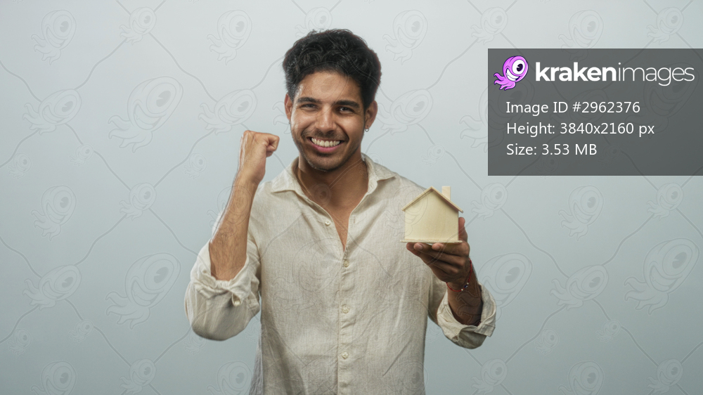 Young hispanic man holding small wooden house model in his left hand while pumping his right fist and smiling toward camera in studio; homeownership joy. - Kraken Images