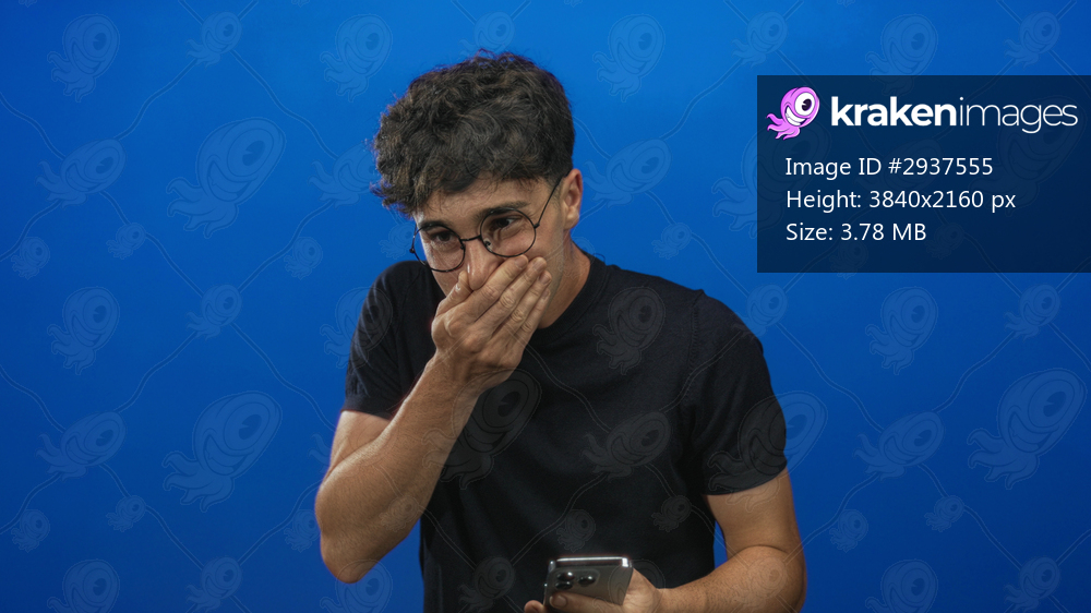 Young hispanic man holding smartphone, covering mouth with hand against bright blue studio backdrop; surprise reaction.