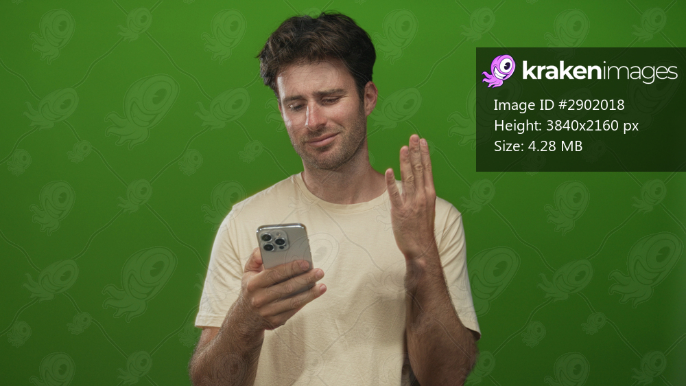 Young hispanic man holding smartphone in one hand and making a raised palm gesture with the other in a green studio; frustration.
