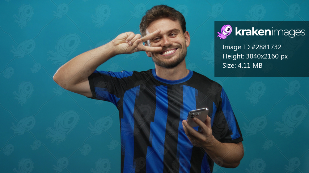 Young hispanic man holding smartphone and making peace sign at camera in teal studio; playful connection.