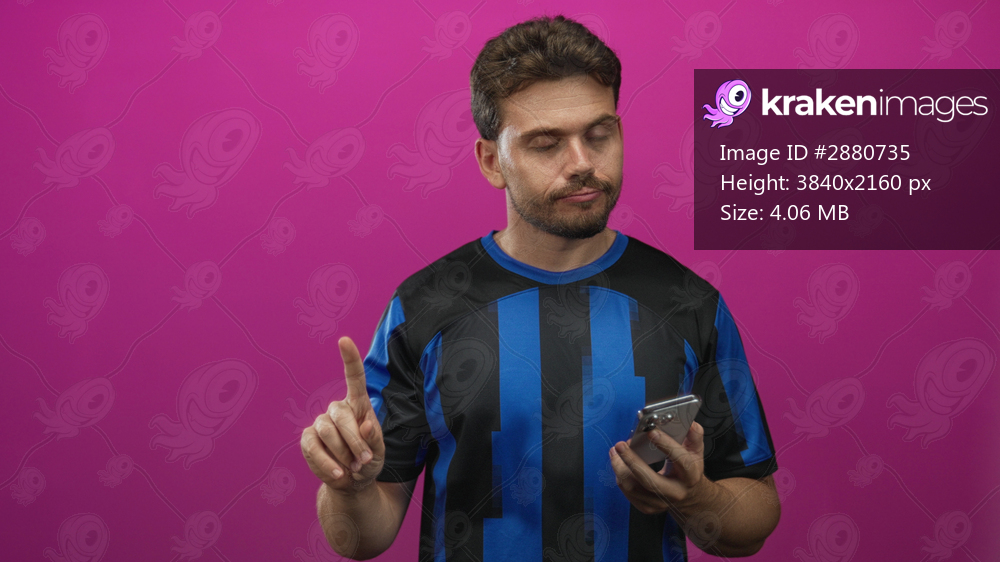 Young hispanic man holding smartphone and pointing finger in magenta studio; skepticism technology communication.