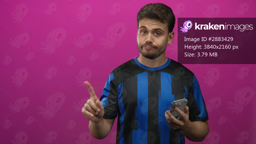 Young hispanic man holding smartphone and pointing finger in magenta studio; skepticism technology communication.
