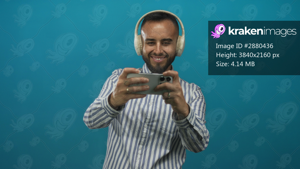 Young hispanic man holding smartphone and smiling, wearing headphones and striped shirt in teal studio for casual content creation; fun relaxation.
