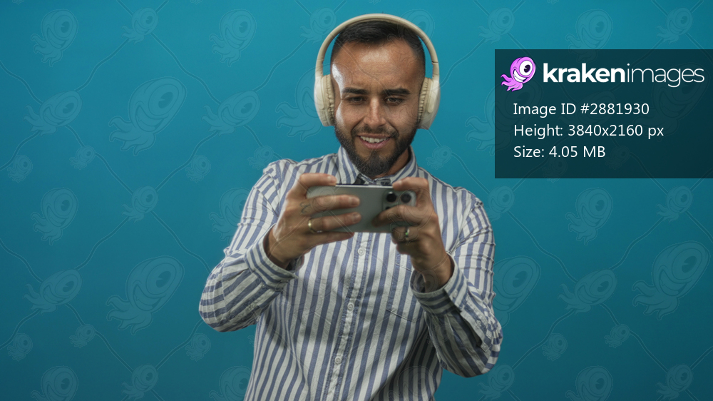 Young hispanic man holding smartphone and smiling, wearing headphones and striped shirt in teal studio for casual content creation; fun relaxation.