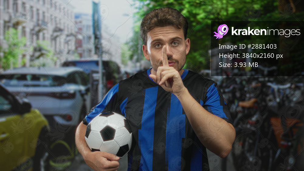 Young hispanic man holding soccer ball, finger to lips for silence on busy city street; secret quiet.