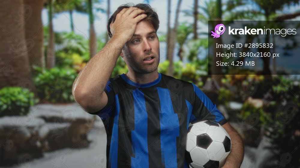 Young hispanic man holding soccer ball with hand on head in park wearing blue and black jersey looking down; disappointment.