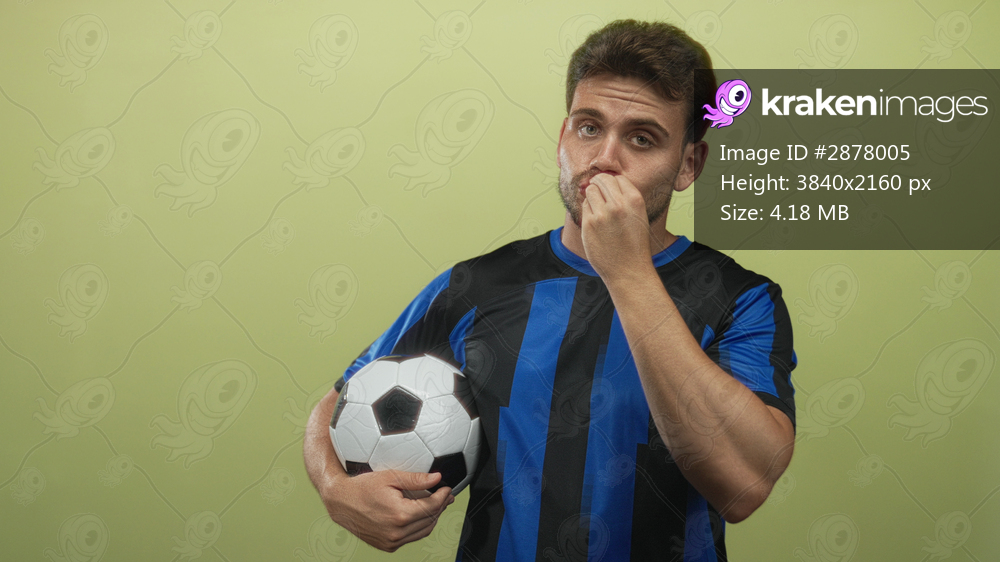Young hispanic man holding soccer ball and pinching nose in studio with light green wall and blue striped jersey; disgust.