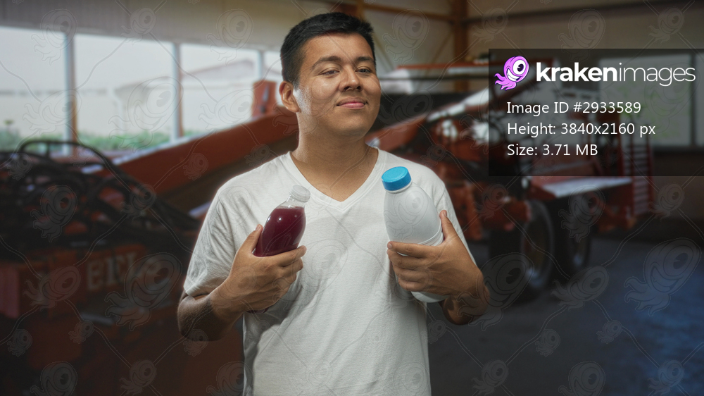 Young hispanic man holding two plastic bottles to his chest in a building wearing a white t shirt and slight smile; everyday pride.