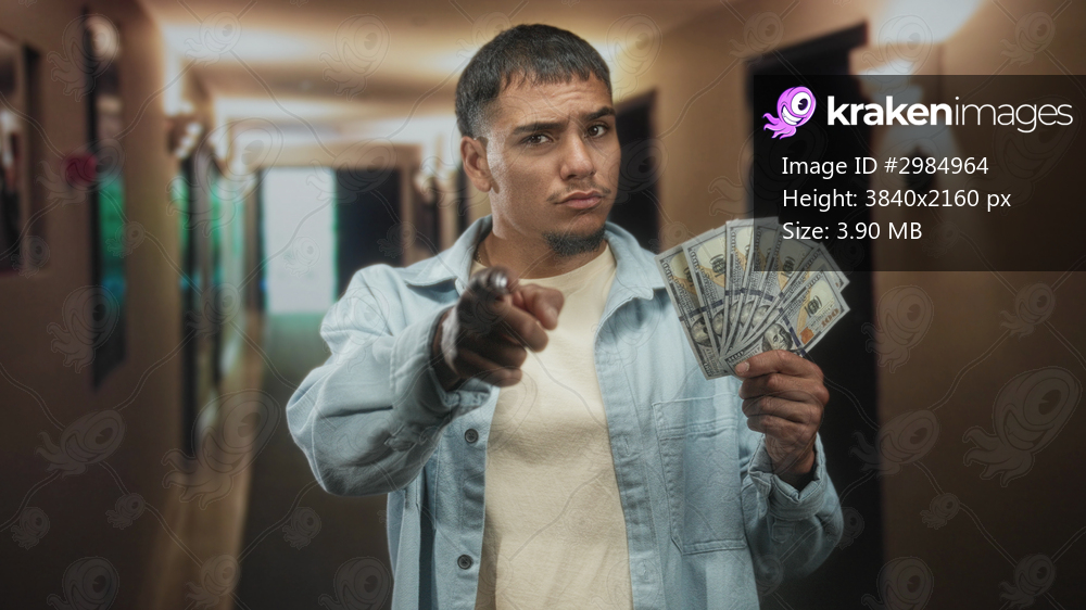 Young hispanic man holding us dollar bills and pointing finger in a hotel corridor with wall sconces and doors visible; bravado confidence.