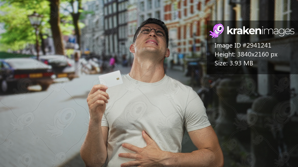 Young hispanic man holding white card near chest and clutching stomach with free hand while standing on a busy city street; anxiety.