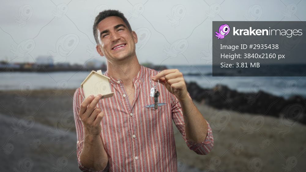 Young hispanic man holding wooden house model and keys on sandy beach by the seaside pier while smiling broadly; homeownership pride.