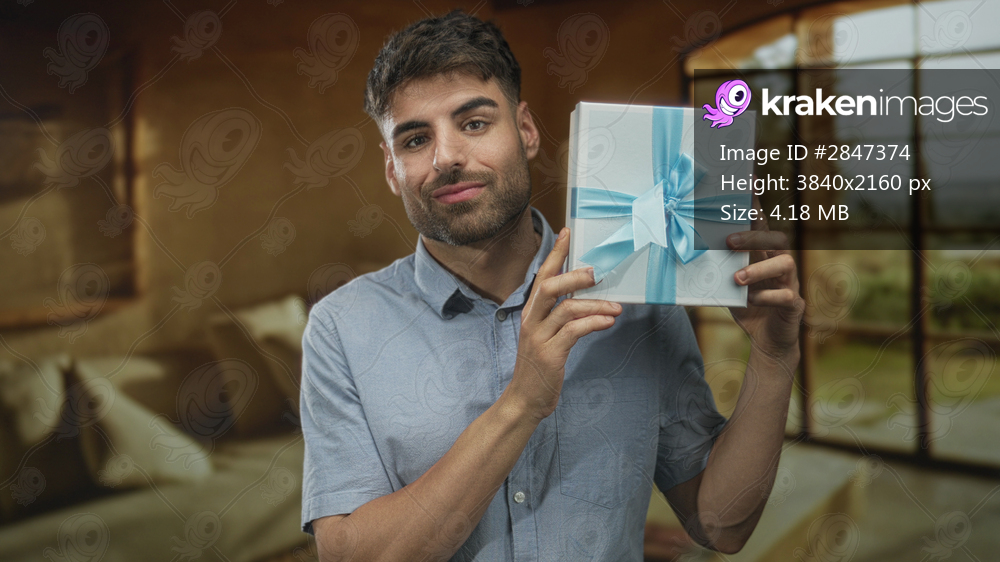 Young hispanic man holds blue ribboned gift box with hand and smiles in studio; celebration surprise.