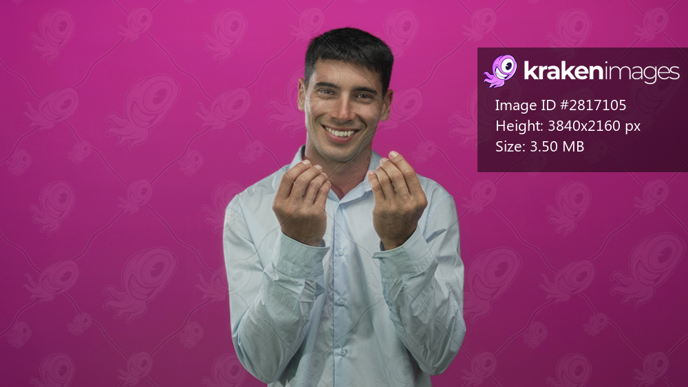 Young hispanic man holds both hands in money gesture against a pink studio wall; playfulness prosperity.