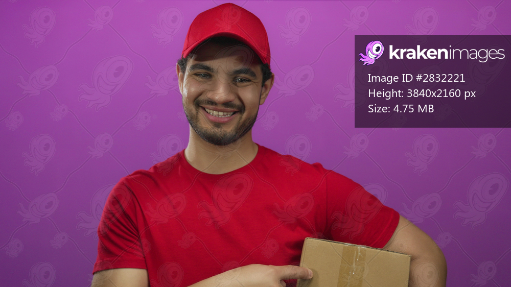 Young hispanic man holds cardboard box while wearing red cap and smiling in purple studio setting; happiness.