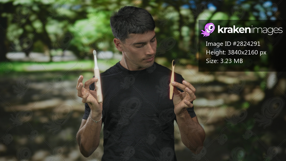Young hispanic man holds electric toothbrush and bamboo toothbrush side by side in green park; sustainable choice.