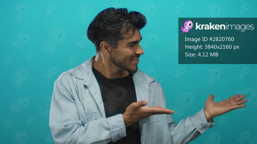 Young hispanic man holds open palm in studio before a turquoise wall and smiles confidently; openness.