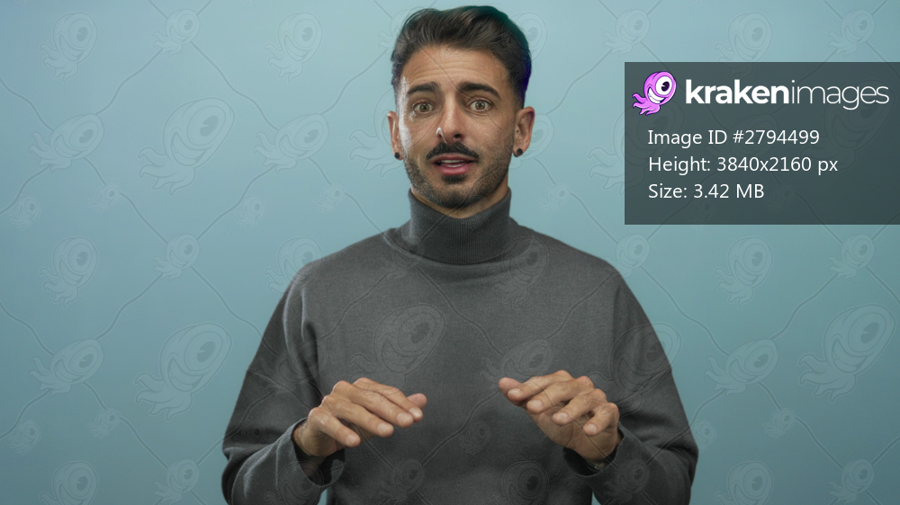 Young hispanic man holds palms out in blue studio making a gentle stopping gesture with focused gaze; serenity.