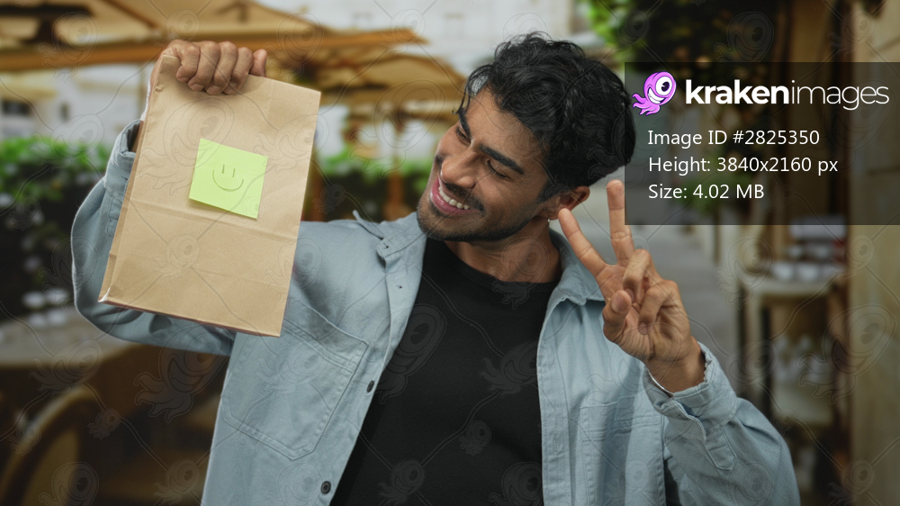 Young hispanic man holds paper bag, smiles and gives thumbsup gesture on street terrace; happiness satisfaction.