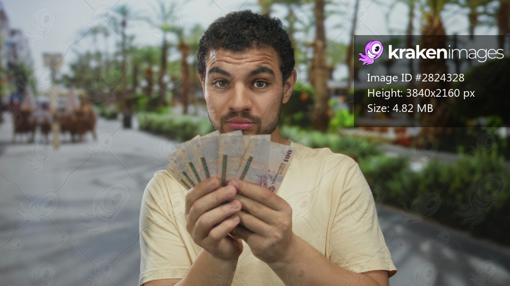 Young hispanic man holds saudi riyal banknotes in hands on street with palm trees and green foliage; prosperity.