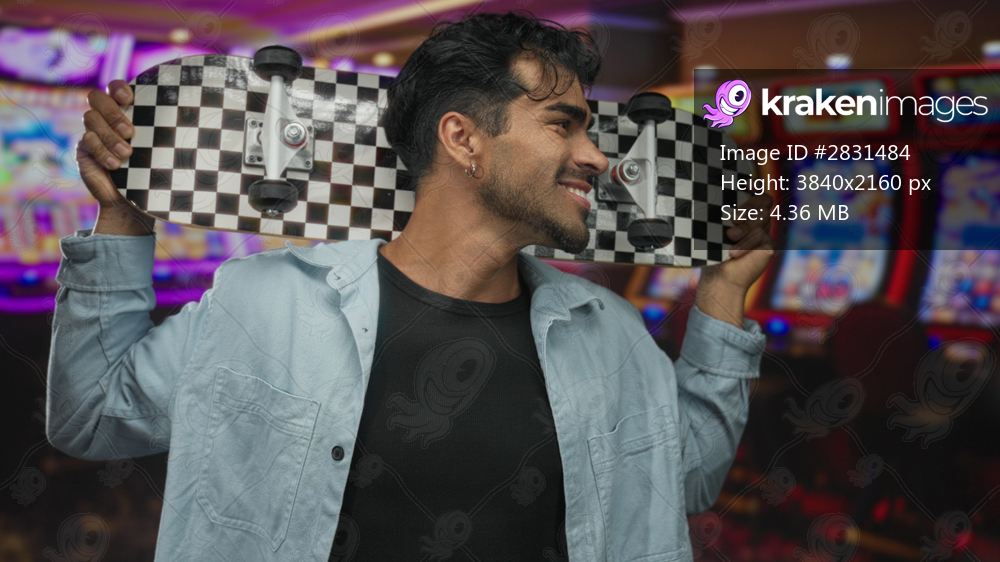 Young hispanic man holds skateboard behind shoulders and smiles broadly near slot machines in casino; playfulness.