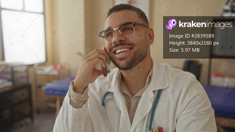 Young hispanic man holds smartphone with both hands and smiles in clinic; professional communication.