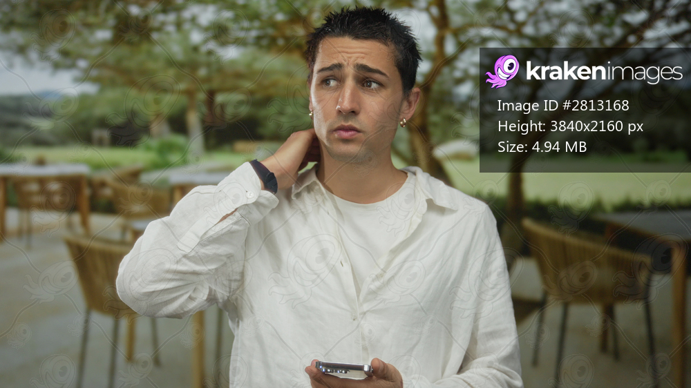 Young hispanic man holds smartphone in one hand while rubbing his neck at an outdoor restaurant terrace; discomfort.