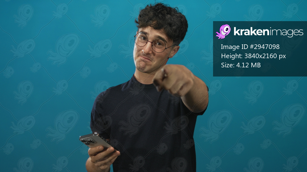 Young hispanic man holds smartphone and makes l hand gesture against teal studio backdrop; skeptical.