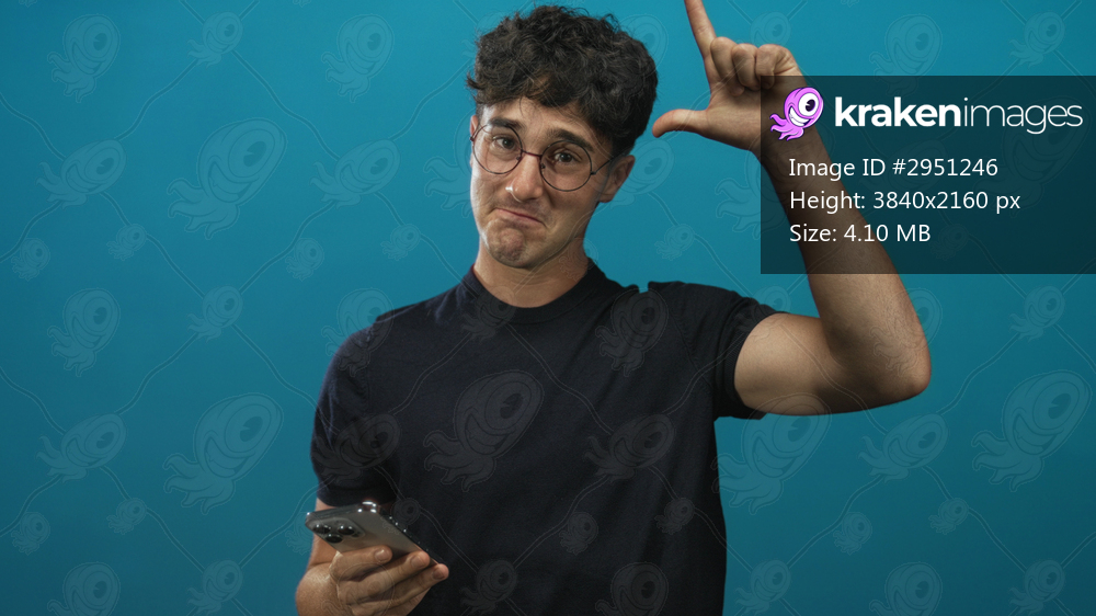Young hispanic man holds smartphone and makes l hand gesture against teal studio backdrop; skeptical.