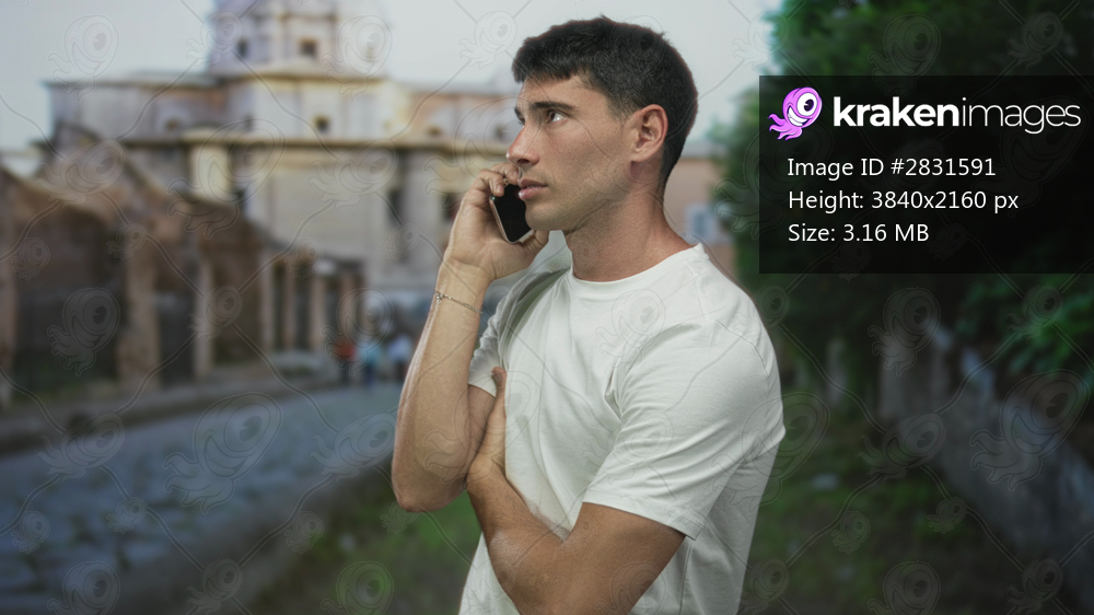 Young hispanic man holds smartphone to ear and cradles elbow on historic cobblestone street; concern.