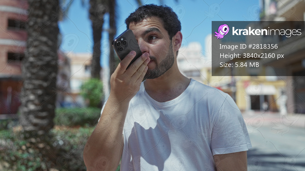 Young hispanic man holds smartphone to ear on a sunlit street lined with palm trees and storefronts; contemplation.