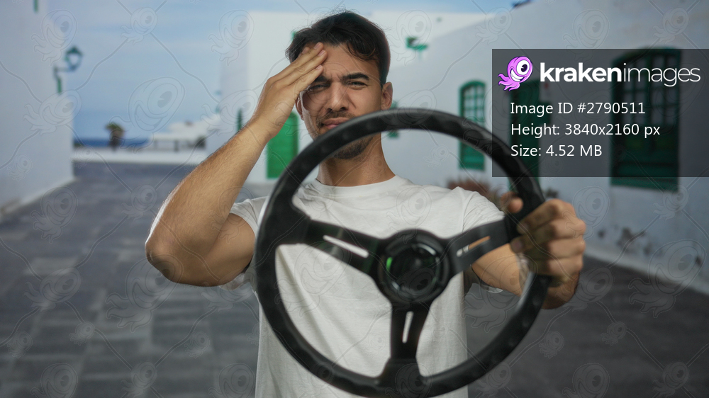 Young hispanic man holds steering wheel outdoors in sunny urban area with white buildings and feels confused.
