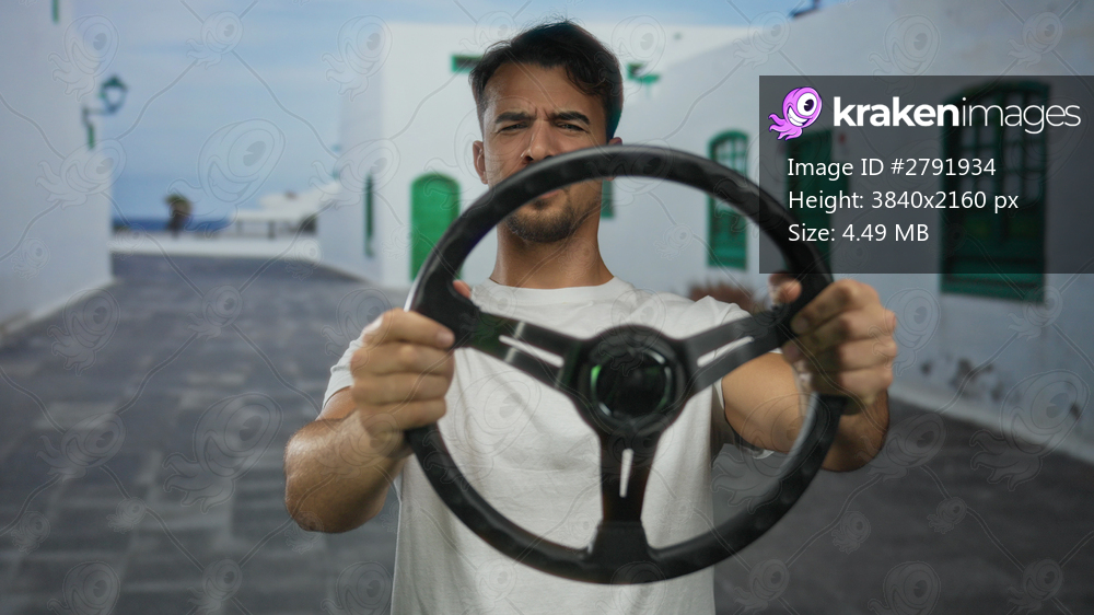 Young hispanic man holds steering wheel outdoors in sunny urban area with white buildings and feels confused.