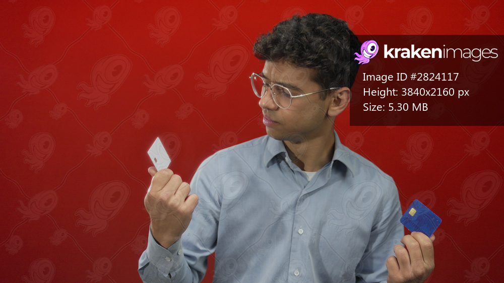 Young hispanic man holds two white and blue creditcards against a red studio wall with hesitant gaze; uncertainty.