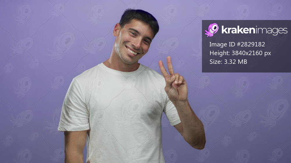 Young hispanic man holds up victory sign with hand against purple studio wall; peace joy happiness optimism.