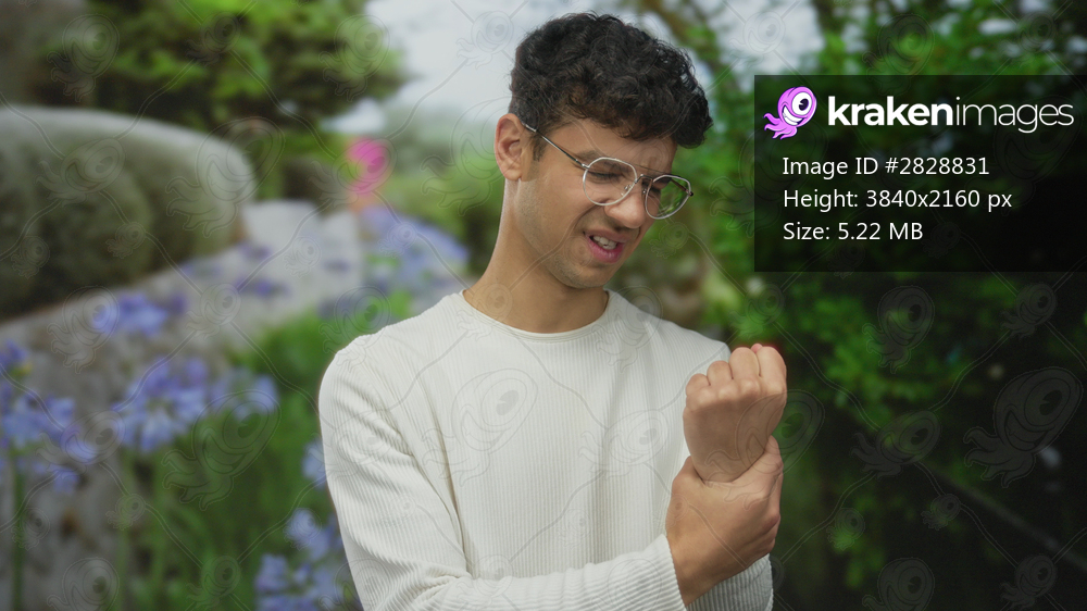 Young hispanic man holds wrist amid blooming flowers and trimmed hedges in a green park pathway; discomfort.