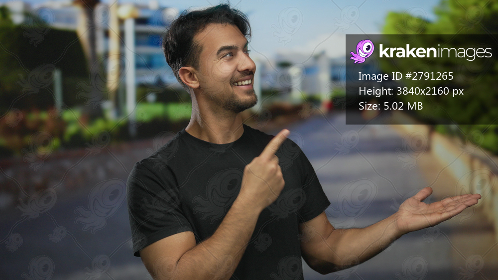 Young hispanic man in a black shirt smiles and gestures pointing upwards on a sunny street with modern urban background.