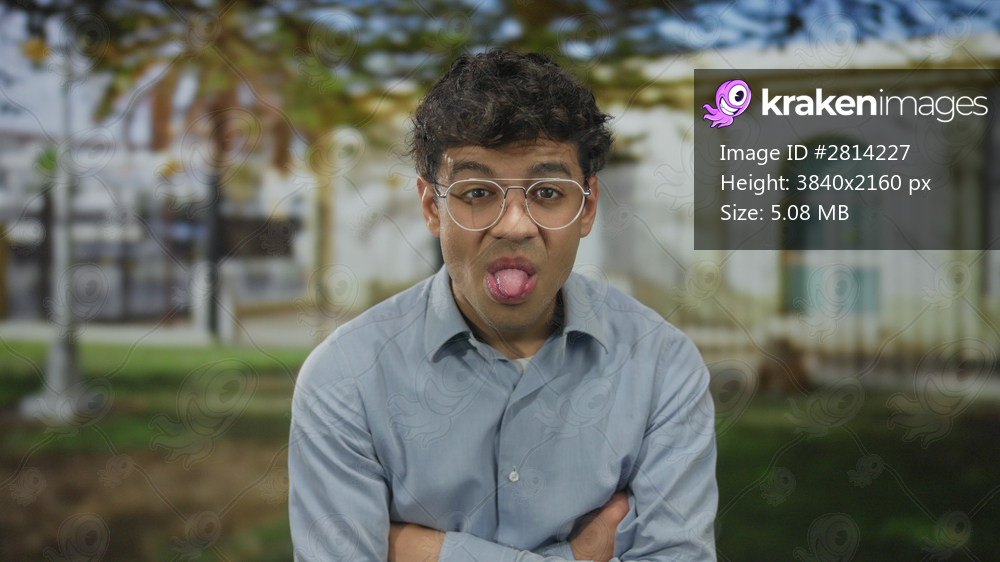 Young hispanic man in a blue shirt and glasses sticks out tongue and crosses arms in a building courtyard framed by trees; mischief.