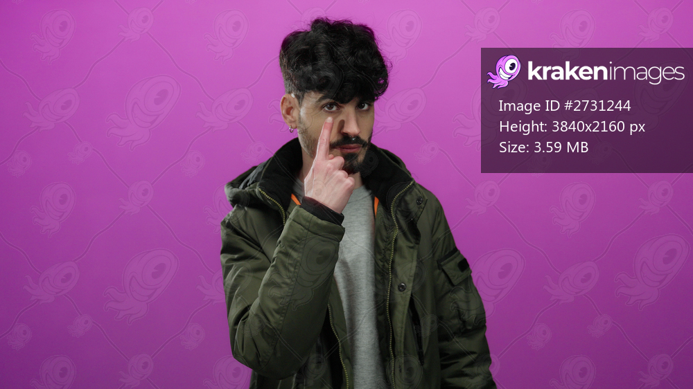 Young hispanic man in a green jacket makes a gesture of vigilance with his finger on a vibrant pink background, expressing watchfulness and attention.