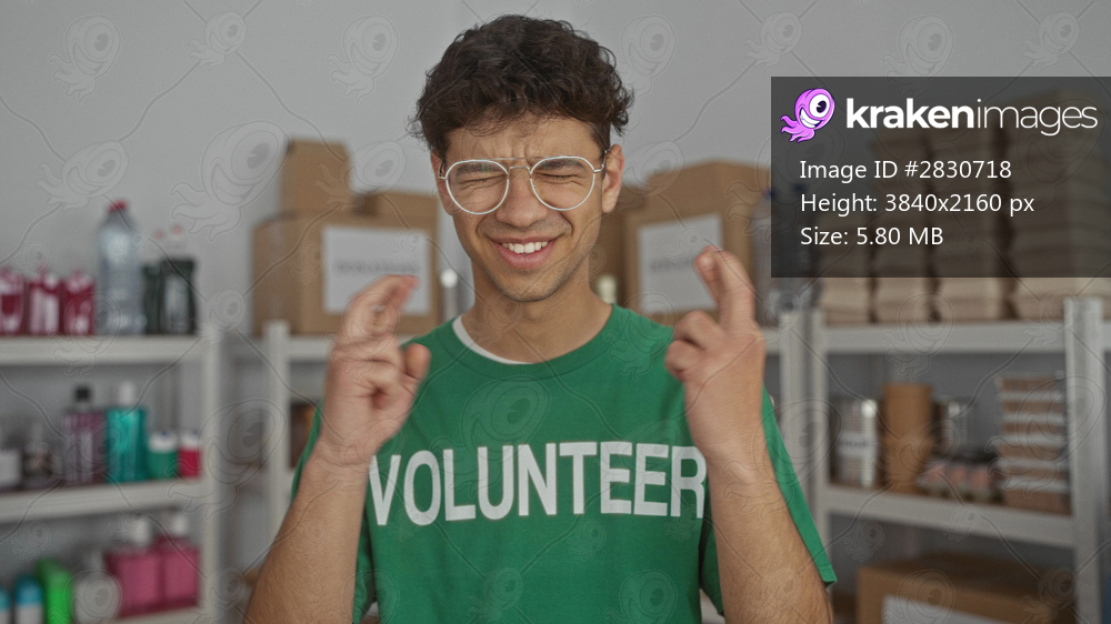 Young hispanic man in a green volunteer shirt crossing fingers beside donation boxes in building; hope.