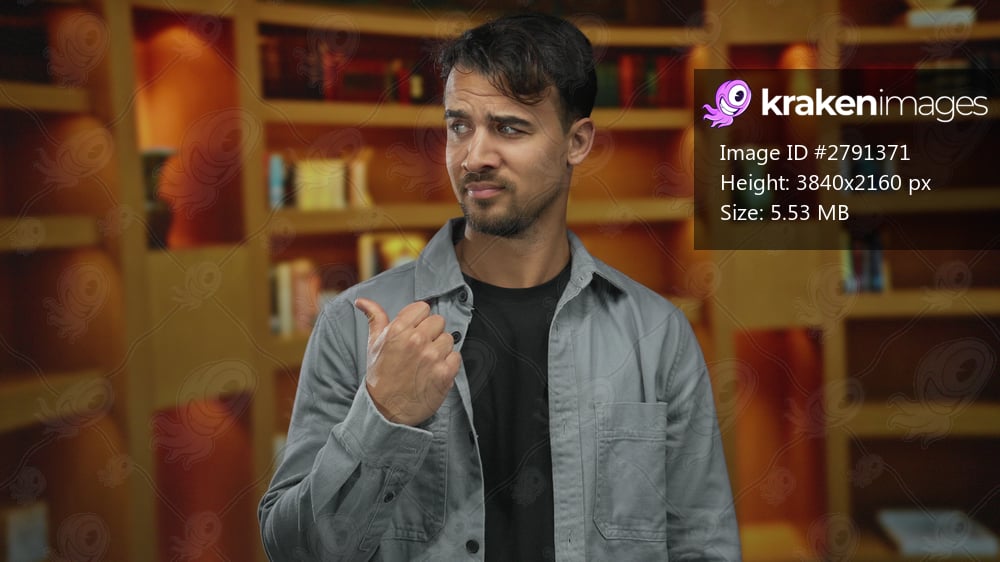 Young hispanic man in a library pointing his thumb to the side with a curious expression against a background of wooden bookshelves and soft lighting.